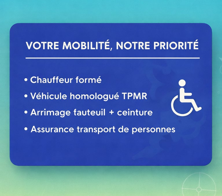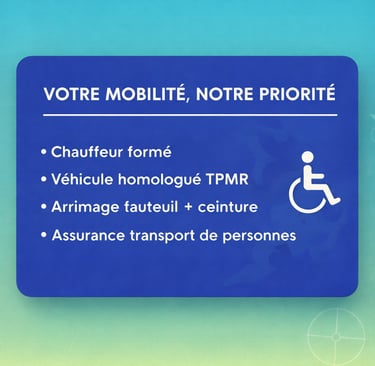 Il est important de préciser que nos prestations ne sont pas prises en charge par la Sécurité sociale. Toutefois, nous proposons une alternative idéale pour ceux qui recherchent un transport PMR fiable, ponctuel et respectueux.